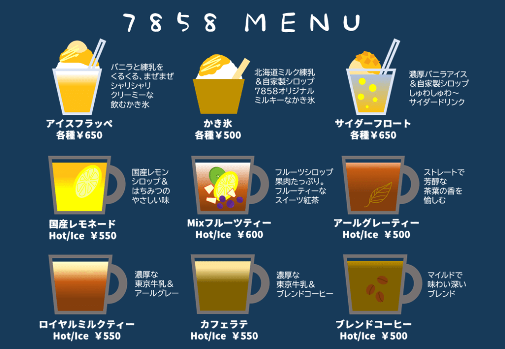 金/土曜日13時より7858Baseではドリンクメニューを販売。 「かしべや」でもご利用できます。